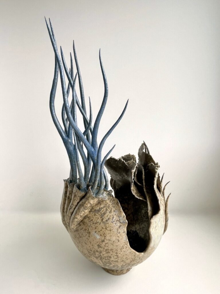 C’est cette magie de la transformation que ‘Vague’ cherche à incarner. Par son alliage subtil de couleurs – sables des profondeurs, bleu de l’océan, blancheur de l’écume. Par sa forme ronde, pleine, protectrice – à la fois tellurique et fluide, évoquant la stabilité d’un noyau et le mouvement perpétuel de l’eau. Par ses arborescences marines, enfin – délicates ramifications qui suggèrent la croissance, l’expansion, la vie à l’œuvre.